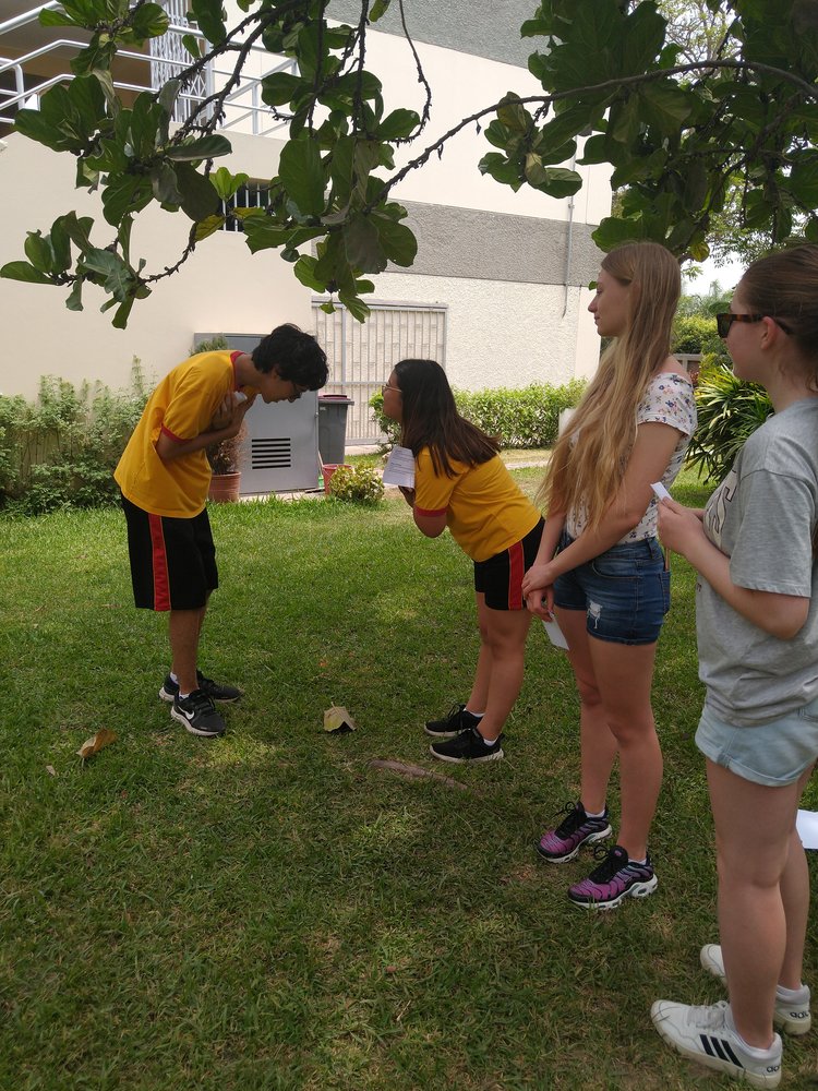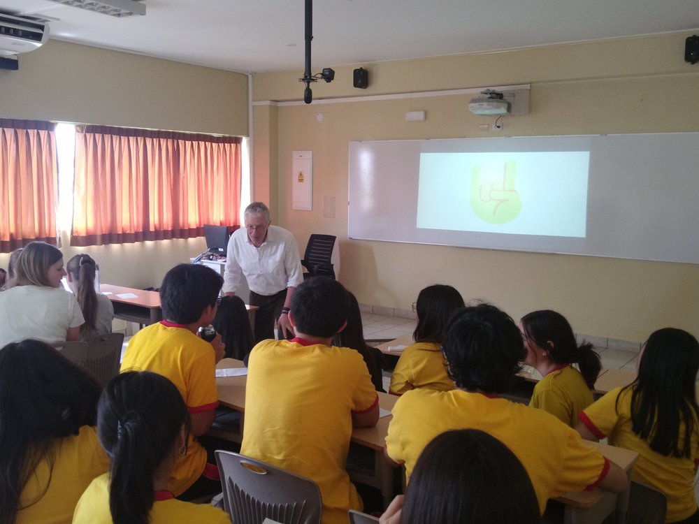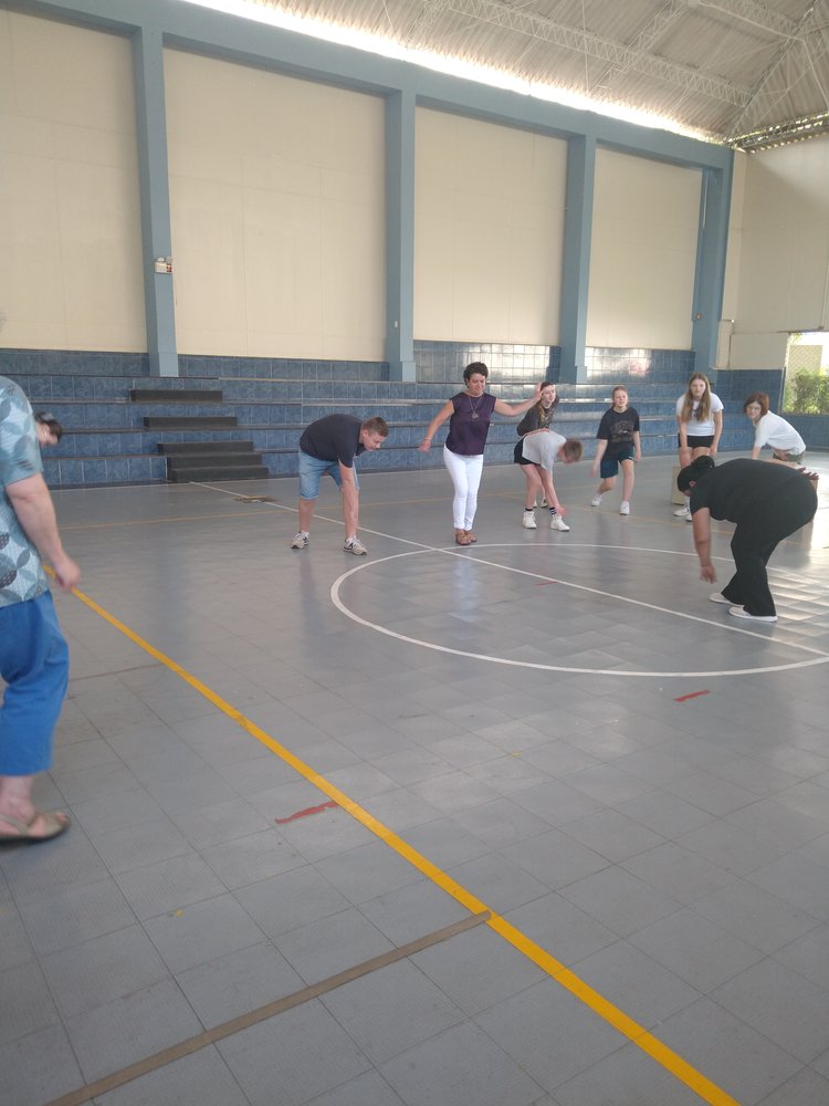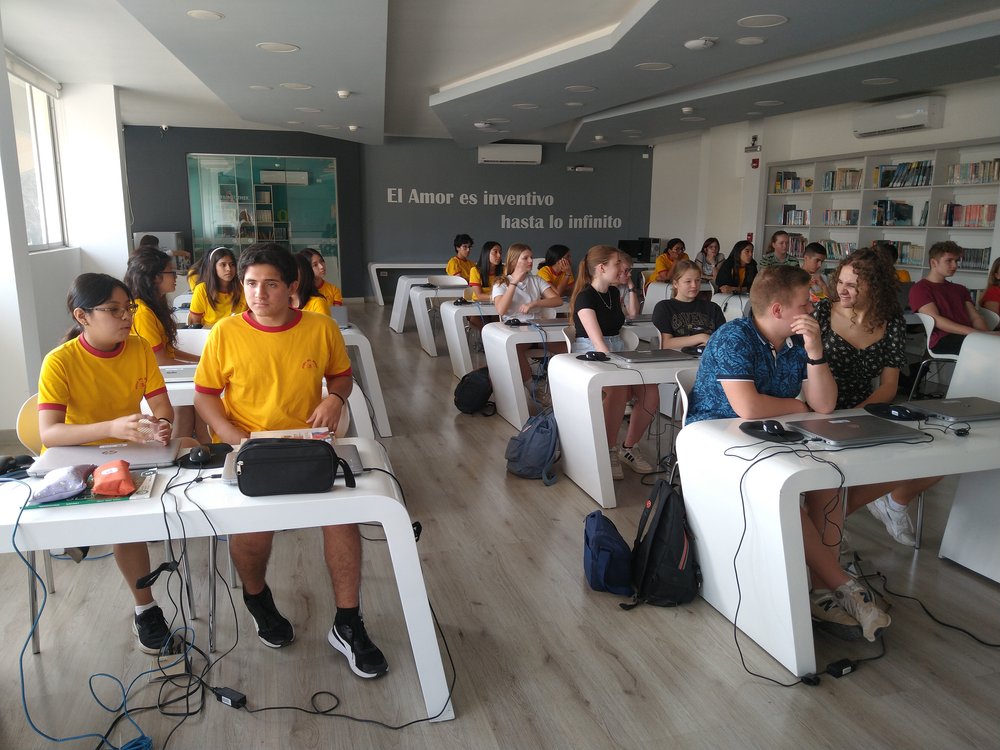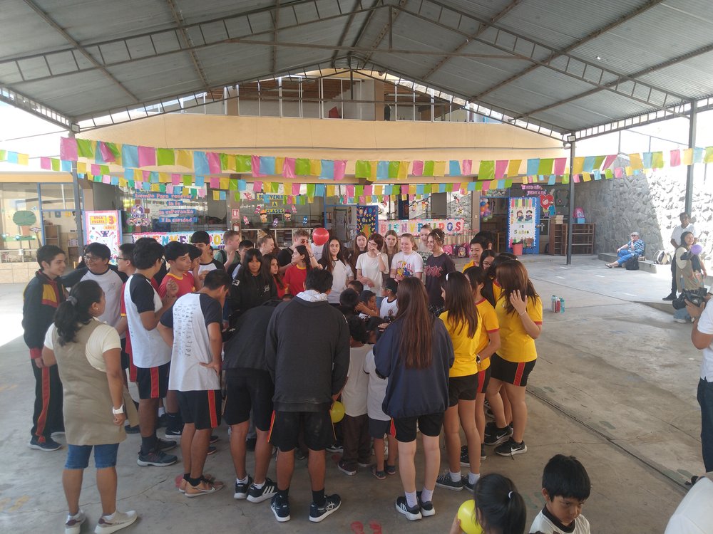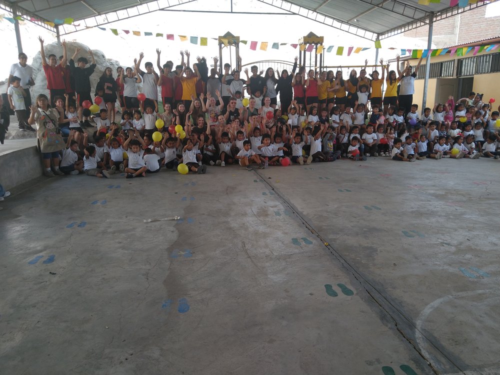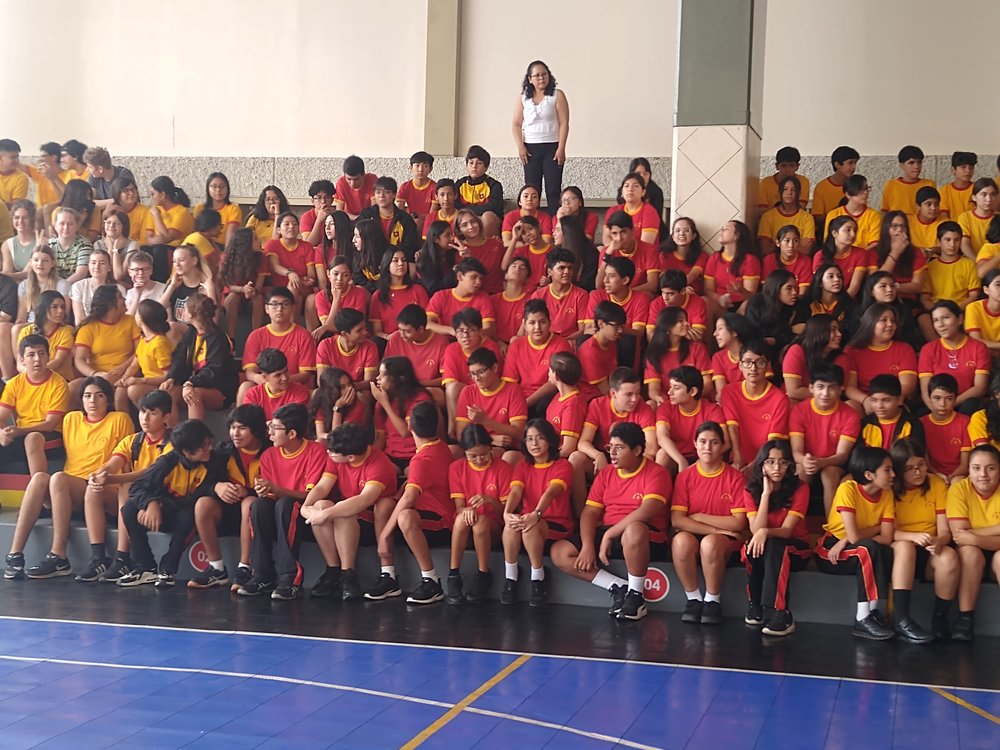 Zur Begrüßung in der Schule gab es einen mittleren Staatsakt in der Sporthalle mit der gesamten Sek I (s. Foto mit Schülern auf der Tribüne), einschließlich des Singens der deutschen und peruanischen Hymne.