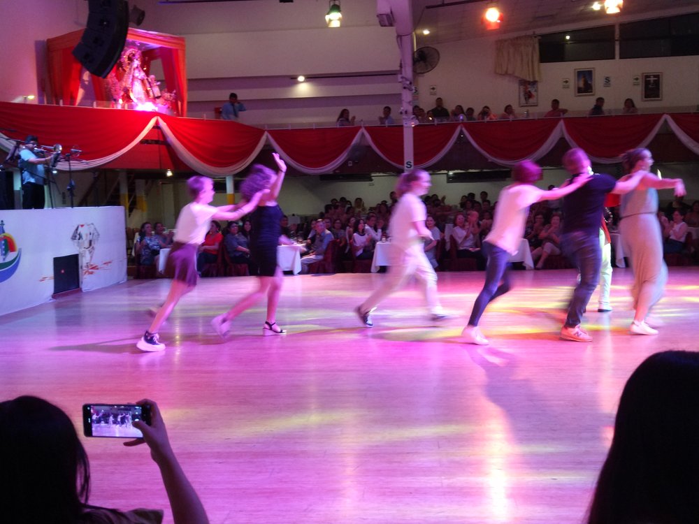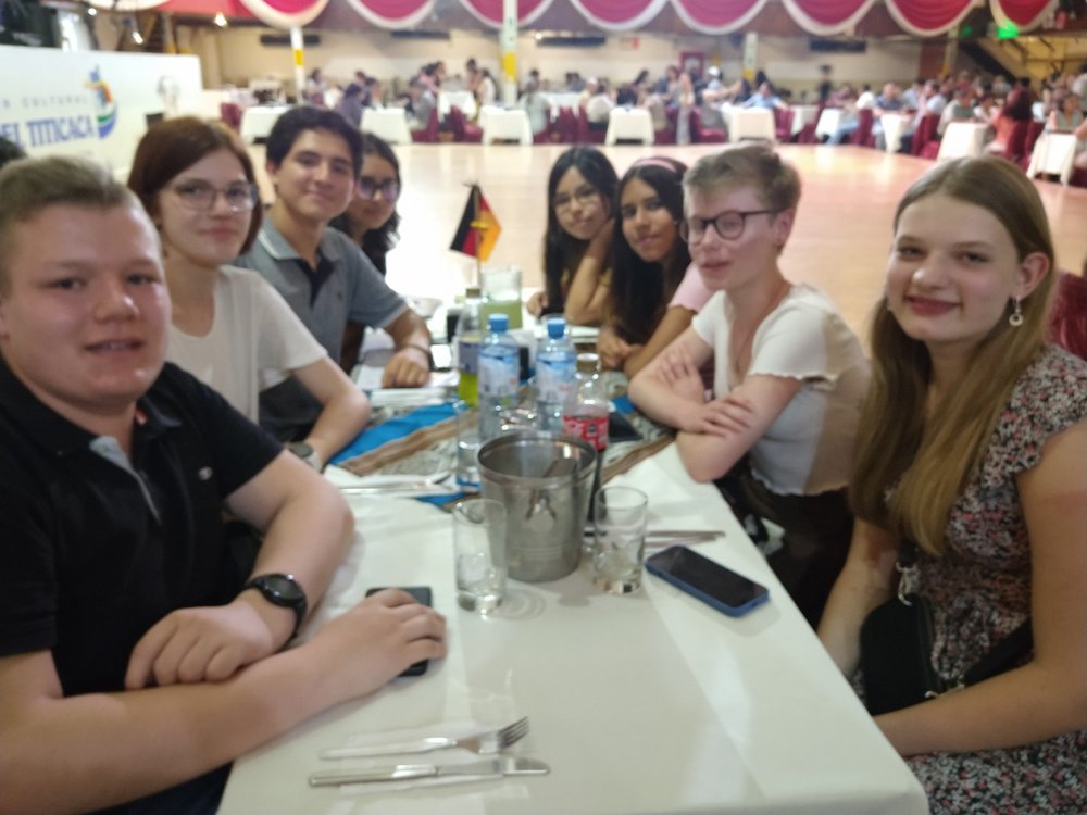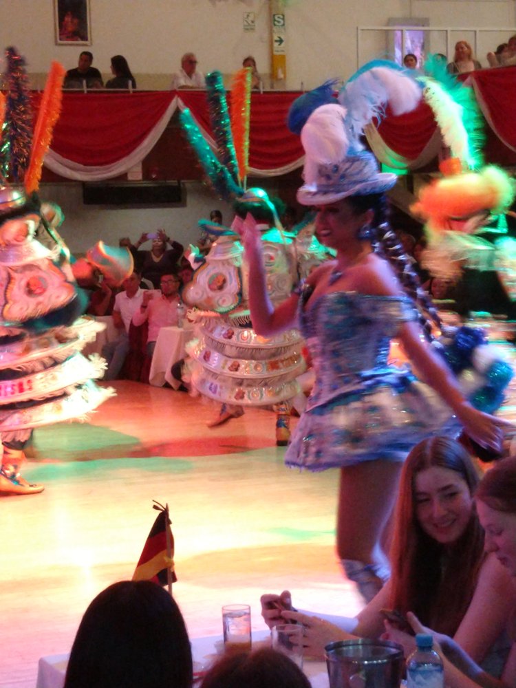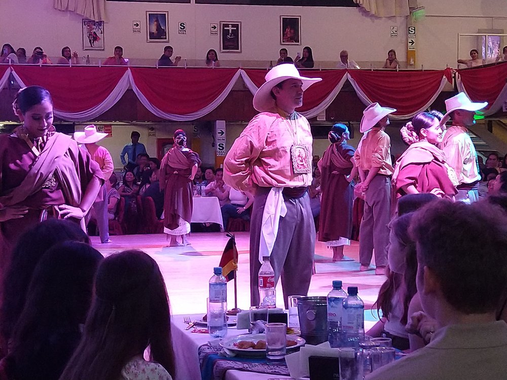 Es gab Musik und Tänze aus verschiedenen Regionen Perus. Dazu wurden alle internationalen Gäste nach Nationen begrüßt und bekamen für einen eigenen Tanz Musik aus ihrem Land - bei uns war es Rosamunde (eine böhmische Polka!).