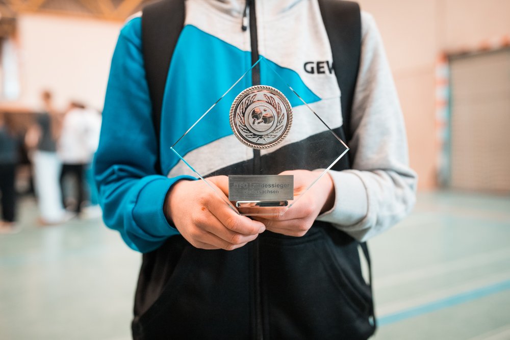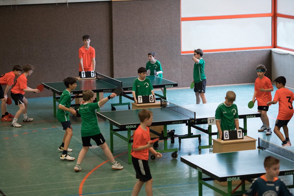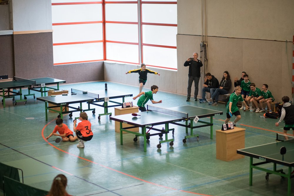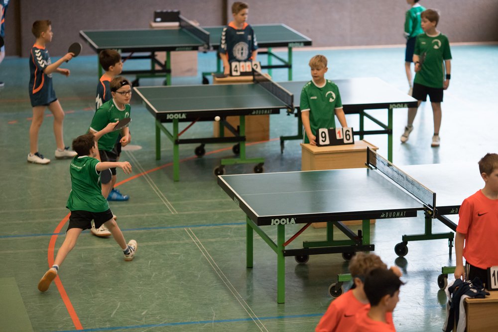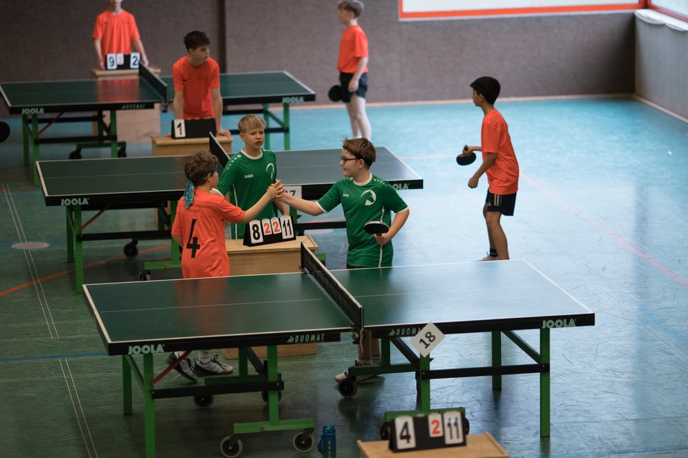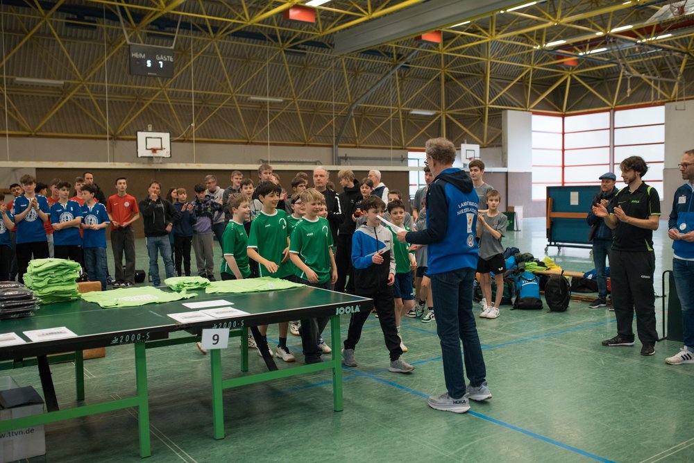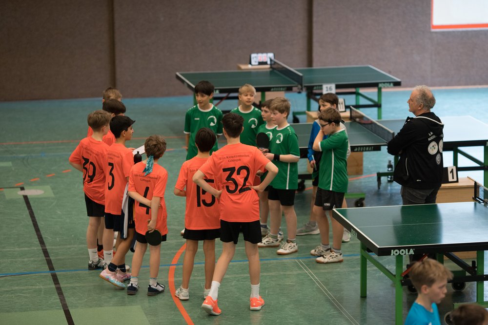 Das Turnier startete mit zahlreichen Mannschaften aus ganz Niedersachsen um 10.30 Uhr und die Jungs vom Gymnasium Himmelsthür wurden von Anfang an großartig unterstützt von den mitgereisten Eltern. Im ersten Spiel konnte die Mannschaft vom Gymnasium Tostedt souverän mit 5-0 besiegt werden, ein vielversprechender Start ins Turnier. Der zweite Gegner von der Graf-Anton-Günther-Schule in Oldenburg war schon deutlich stärker. Zum Glück konnten nicht nur die Doppel sondern auch die teils sehr engen Einzelspiele gewonnen werden. Am Ende hieß es 5-2 für Himmelsthür. Nun kam es zu einem echten Finale gegen die Mannschaft vom Felix-Klein-Gymnasium aus Göttingen, und das war an Dramatik nicht zu überbieten.