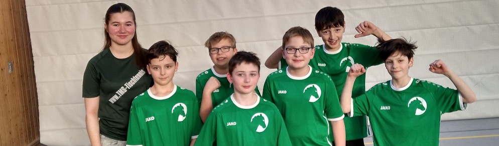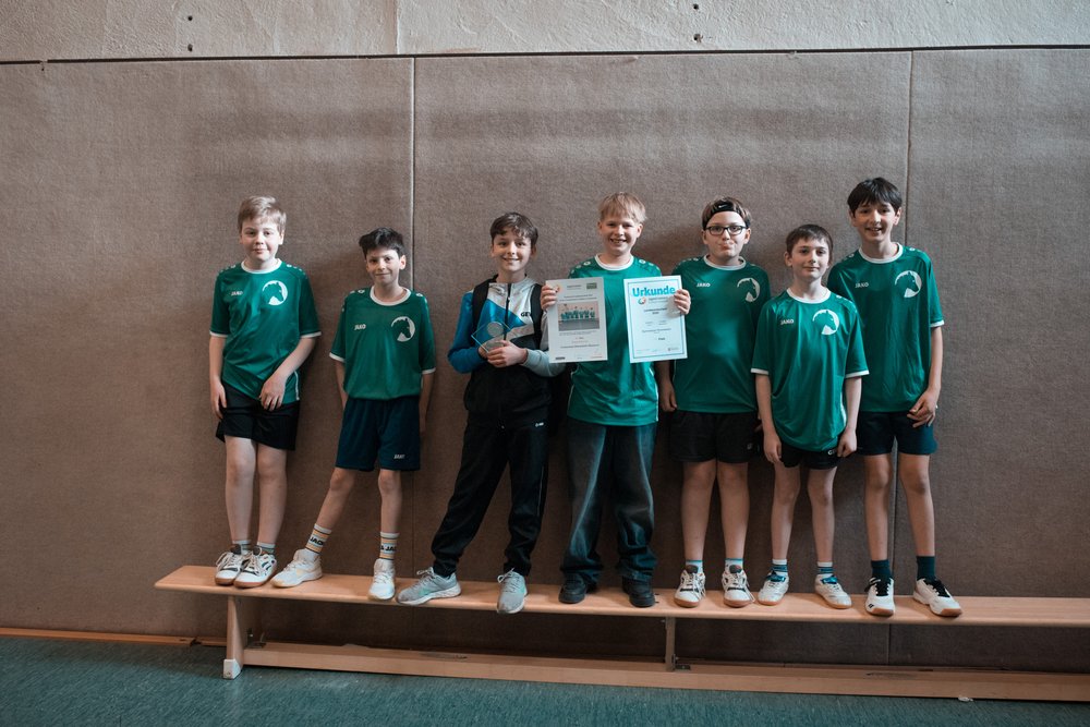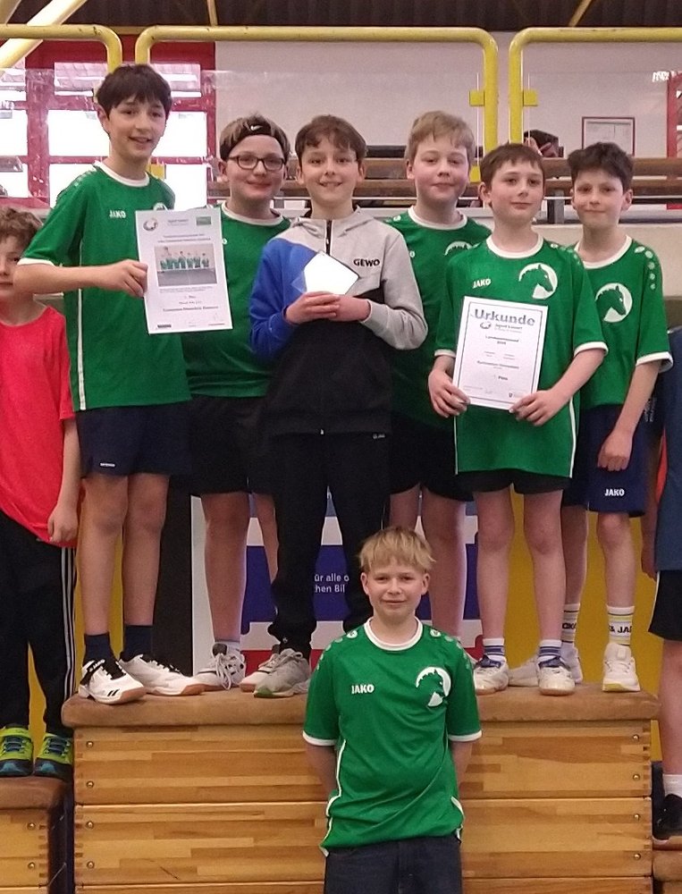Die beiden Doppel, eigentlich eine besondere Stärke der „Fohlen“, gingen unglücklich verloren und wir lagen nach zwei weiteren engen Matches 1-4 zurück; nun mussten also alle noch ausstehenden Spiele gewonnen werden. Johann und Ethem gewannen ihre Einzel gegen starke Gegner souverän, und auch Lukas konnte sein spannendes Spiel dank seiner Nervenstärke in fünf Sätzen für sich entscheiden. Die präzisen und aufmunternden Hinweise von Coach Franka erwiesen sich bei dieser Aufholjagd als sehr hilfreich. Es stand tatsächlich 4-4, das letzte Doppel musste entscheiden! Das Match ging hin und her, auch hier ging es schließlich in den alles entscheidenden 5. Satz. Beim Stand von 9-9 gab es große Aufregung, weil der folgende Punkt, der Matchball für das GymHim bedeutet hätte, umstritten war und nach langer Diskussion wiederholt werden musste. Beim Stand von 13-12 hatten Luis und Jonathan wieder Matchball, und diesmal klappte es: Punkt für Himmelsthür! Die Fohlen hatten das fast schon verloren geglaubte Spiel doch noch gedreht. Der Jubel bei den Spielern, den Betreuern und den Fans war riesig. Zurecht wurde die Mannschaft gefeiert und bekam auf dem Siegerpodest einen Pokal sowie Urkunden überreicht. Zudem erhielt jeder Spieler eine Schlägerhülle als Geschenk. Auf der zweistündigen Rückfahrt konnten dann alle noch ausgiebig über den phantastischen Erfolg reden, und zeitgleich ließ es sich Herr Kruse nicht nehmen, alle Kolleginnen und Kollegen unserer Schule auf der Dienstbesprechung über den Erfolg der Jungs von der Fohlenkoppel zu informieren. - Eine herausragende Leistung der jungen Mannschaft. Im nächsten Schuljahr heißt es dann: Mission Titelverteidigung!