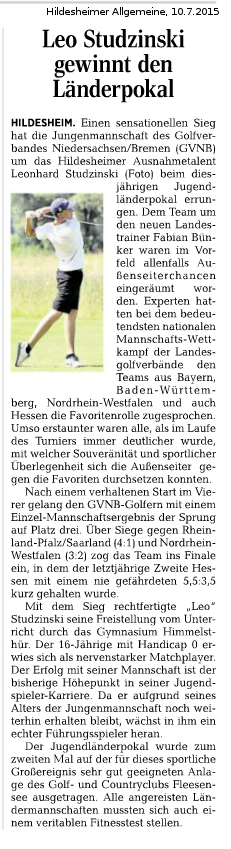 Einen sensationellen Sieg konnte die Jungen-Mannschaft des Golfverbandes Niedersachsen/Bremen (GVNB) um das Hildesheimer Ausnahmetalent Leonhard Studzinski beim diesjährigen Mädchen- und Jungen-Länderpokal erringen. Dem Team um den neuen hauptamtlichen Landestrainer Fabian Bünker waren im Vorfeld allenfalls Außenseiterchancen eingeräumt worden. Tatsächliche und auch selbst ernannte Experten hatten bei dem bedeutendsten nationalen Mannschaftswettkampf der Landesgolfverbände Bayern, Baden-Württemberg, Nordrhein-Westfalen und auch Hessen die Favoritenrolle zugesprochen. Umso erstaunter waren alle, als im Laufe des Turniers immer deutlicher wurde, mit welcher Souveränität und sportlicher Überlegenheit sich die Außenseiter gegen die Favoriten durchsetzen konnten.