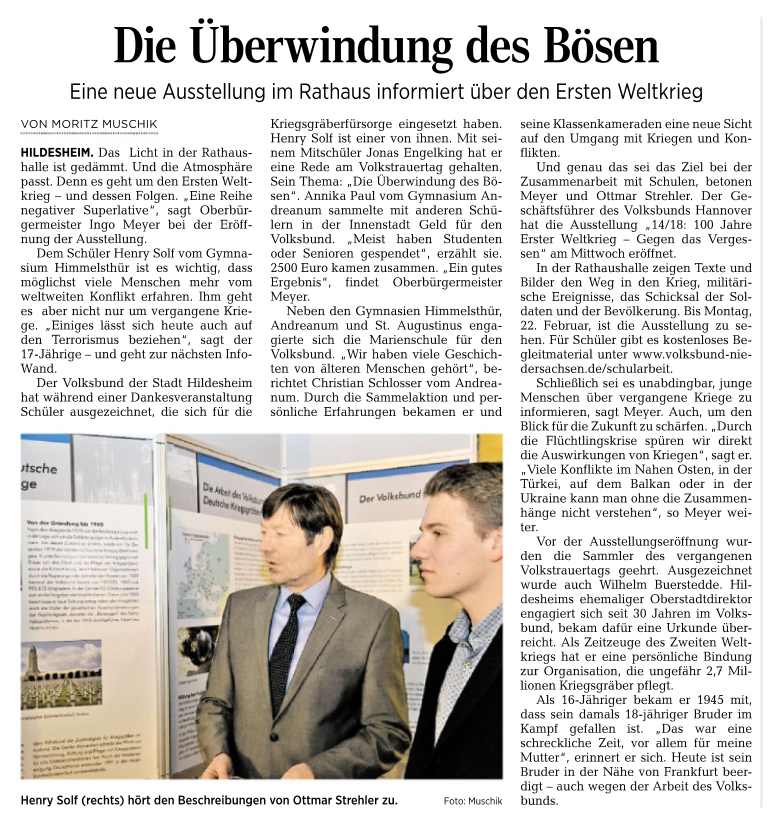 Am Mittwoch, den 10.02. waren Vertreter des Gymnasiums Himmelsthür ins Rathaus der Stadt Hildesheim eingeladen, um den Dank des Oberbürgermeisters für unseren Beitrag zum Volkstrauertag 2015 entgegenzunehmen.