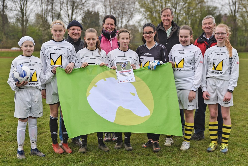 Gleich am nächsten Tag bot sich unseren Mädchen der WK 3 die nächste Chance, aber sie mussten krankheitsbedingt ohne Ersatzspielerin antreten. Im ersten Spiel besiegten sie das Josephinum mit 1:0, es folgte ein 3:0 gegen die Realschule Himmelsthür. Dennoch lag bislang die RBG vorn durch ein besseres Torverhältnis, es galt daher nicht nur weiterhin die Spiele zu gewinnen, sondern auch genügend Tore zu erzielen. Gesagt, getan: Die Marienschule ging mit 9:0 vom Platz und gegen die Albertus-Magnus-Schule erzielten sie 7:0. Nun mussten sie nur noch gegen die RBG antreten, hier hätte mittlerweile bereits ein Unentschieden zum Kreistitel gereicht. Aber die Mädchen waren jetzt richtig in Fahrt und erreichten mit einem 7:0 den Sieg im Kreisentscheid.