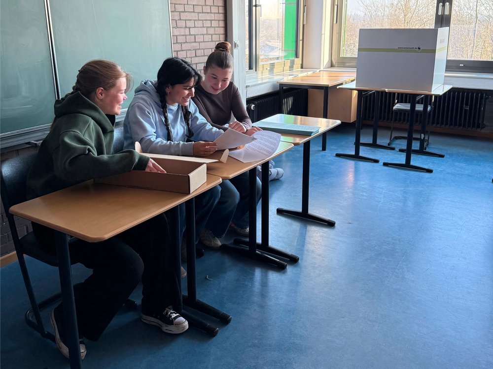 Ein großes Dankeschön geht an die engagierte Klasse 10A, die als Wahlhelferinnen und Wahlhelfer für einen reibungslosen Ablauf gesorgt hat. Am Freitag in der 5. und 6. Stunde wurde es dann richtig spannend: Die Stimmen wurden ausgezählt! Organisiert wurde dies vom Wahlvorstand, bestehend aus Frau Conradi (als Wahlleitung) sowie engagierten Schülerinnen und Schülern der 10A und des PW1-Kurses aus der Q1.