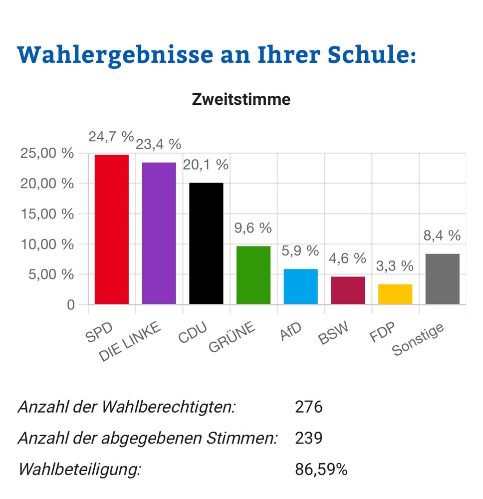 Diese Ergebnisse zeigen, dass junge Menschen sich aktiv mit Politik auseinandersetzen und bereit sind, Verantwortung für ihre Zukunft zu übernehmen. Die Begeisterung und das Engagement der Beteiligten haben verdeutlicht, wie wichtig und spannend politische Bildung sein kann. Die erfolgreiche Durchführung unserer ersten Juniorwahl macht Lust auf mehr – und wir freuen uns schon auf die nächste Wahl!