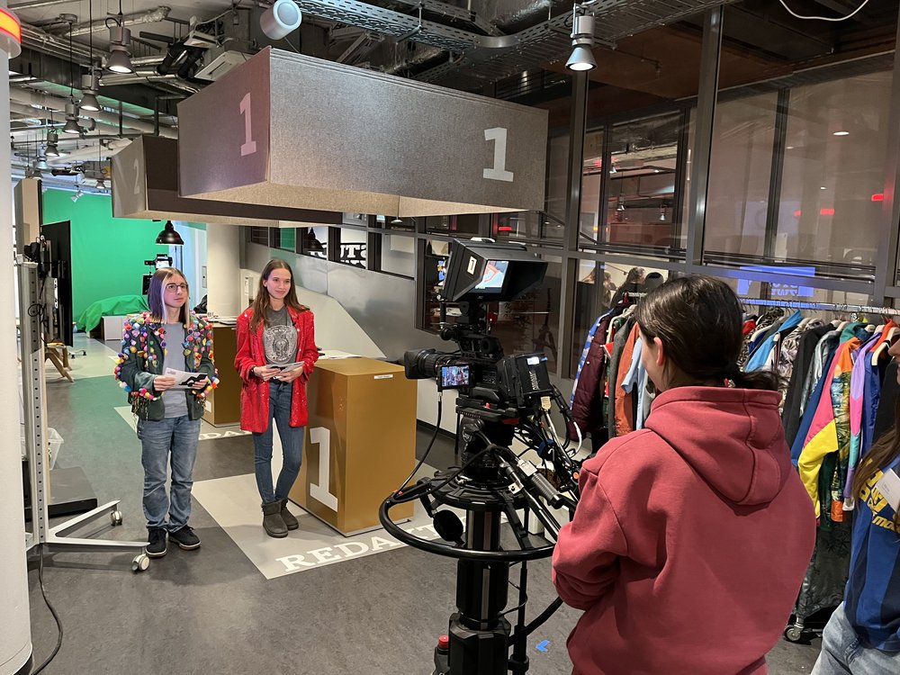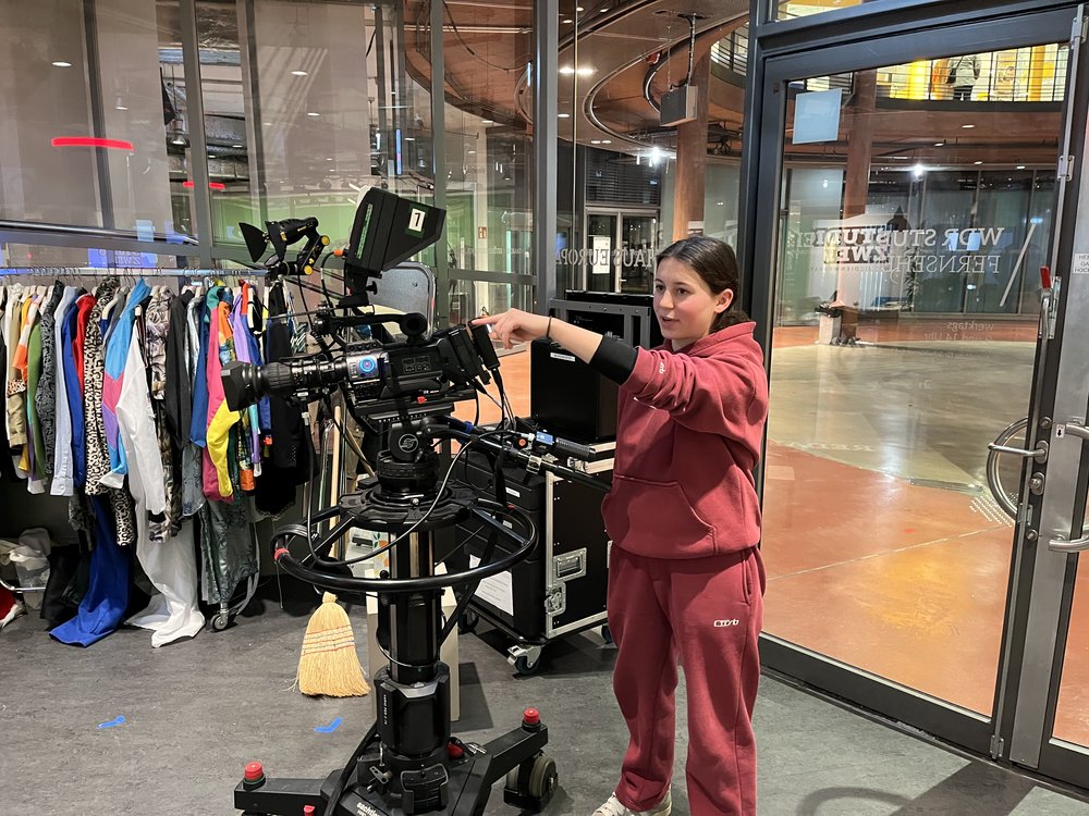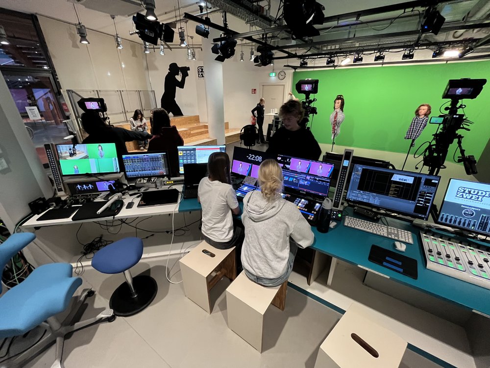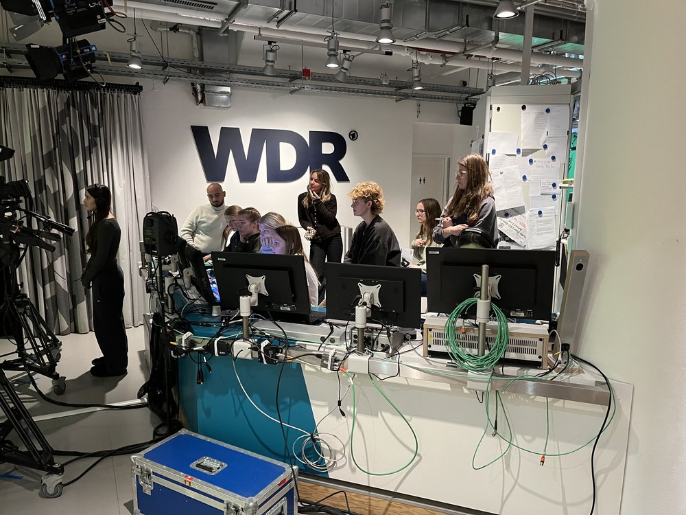 Nach der Anreise am Donnerstagmittag ging es zu Fuß (oder auf dem E-Scooter ;-)) über den Rhein, am Dom vorbei, zu den WDR-Arkaden, wo wir einen eigenen Radio- und Fernsehbeitrag konzipierten und in 3,5 Stunden produzierten. Das hat allen sehr viel Spaß gemacht. Unterstützt von jeweils fünf Redakteur*innen (das gesprochene Gendersternchen war den Mitarbeitenden hier sehr wichtig…) haben wir unsere eigene Sendung aufgenommen.