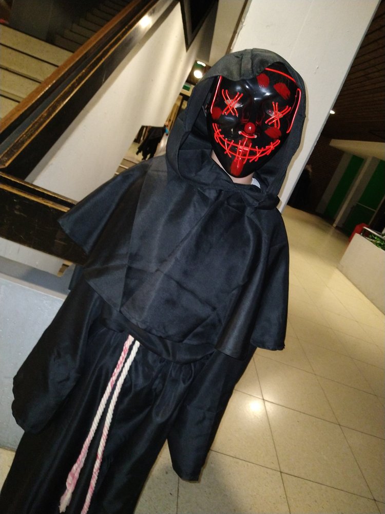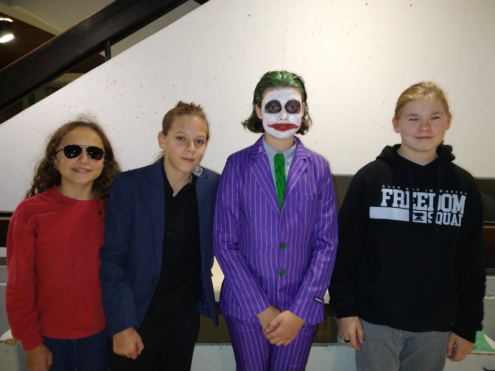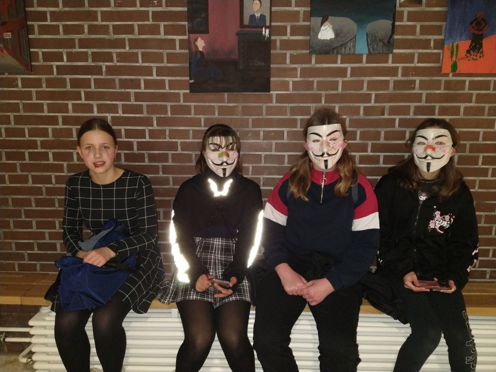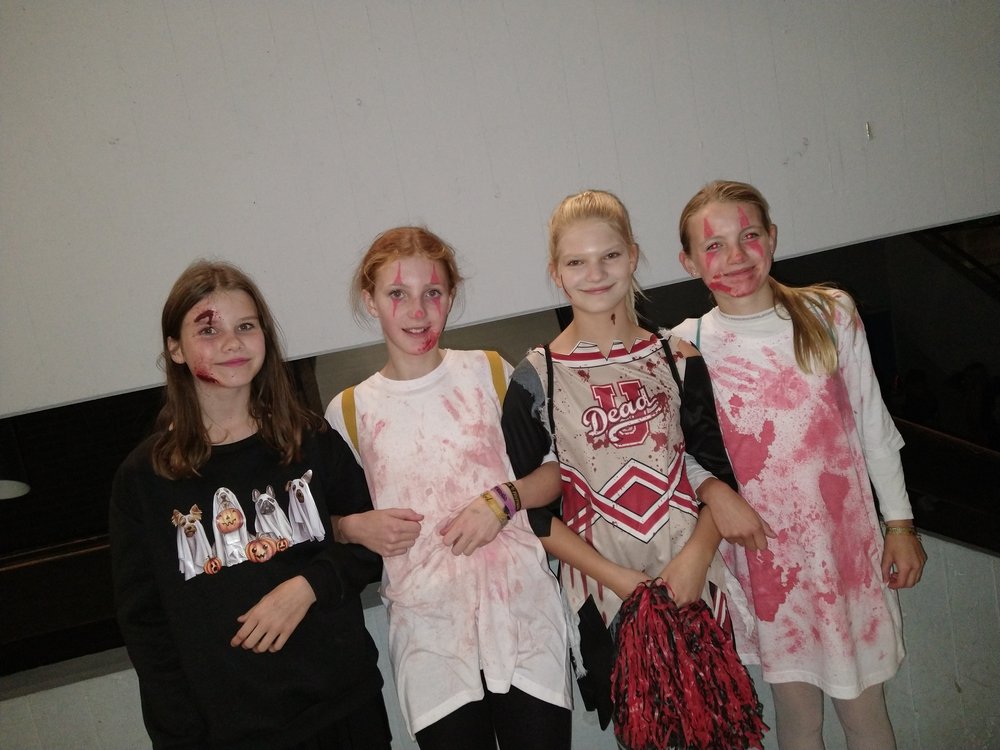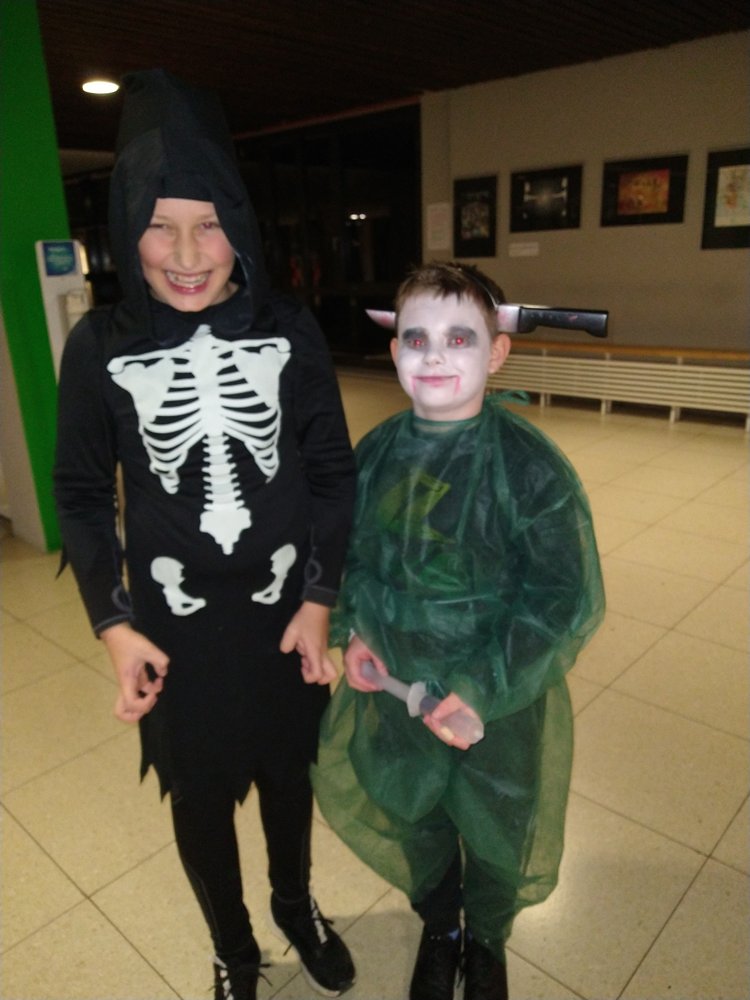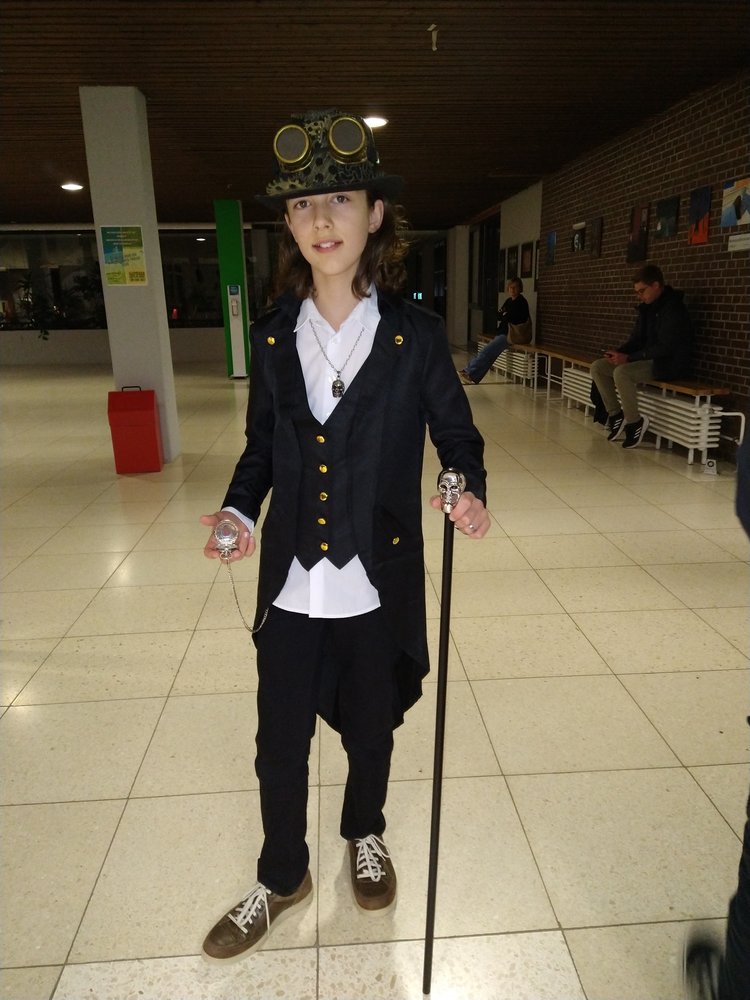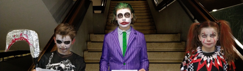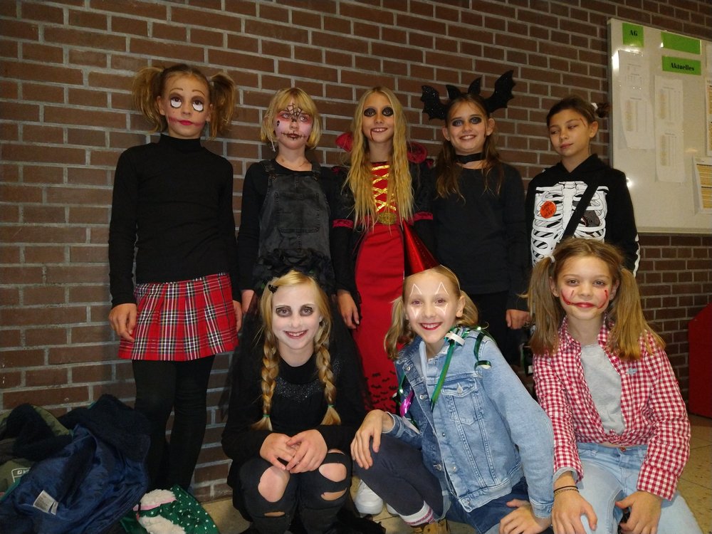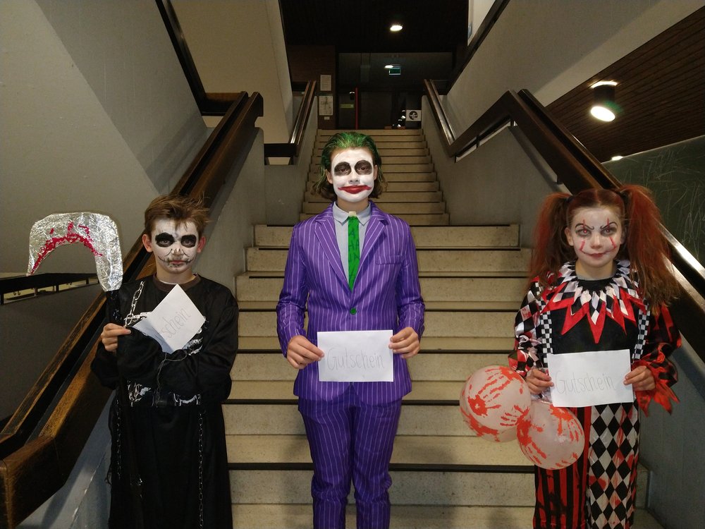 Im Zentrum stand die alte Cafeteria: Ein Ex-Fohlen-DJ sorgte an der Musik- und Lichtanlage für Partystimmung, bis die Menge der Tanzenden laut mitsang. Und bald zog eine Polonaise von Schreckgestalten durch die Schule, während mehrere Schülerinnen und Schüler des Abiturjahrgangs eifrig Getränke verkauften. Und auch unser Schulleiter, Herr Kruse, hat sich davon überzeugt, dass am GymHim sogar die Untoten noch mächtig feiern können. Am Ende wurden von einer fachkundigen Jury die besten Kostüme prämiert: Dabei wurden ... für ihre phantastischen Verkleidungen ausgezeichnet. Allerdings hätten auch noch etliche andere Aufmachungen Preise verdient gehabt. Gegen 20.30 Uhr endete die Horrorshow: Die letzten Gruselgestalten wurden von ihren Eltern abgeholt und stellten die Frage: "Gibt's nächstes Jahr wieder so eine tolle Halloween-Party?"