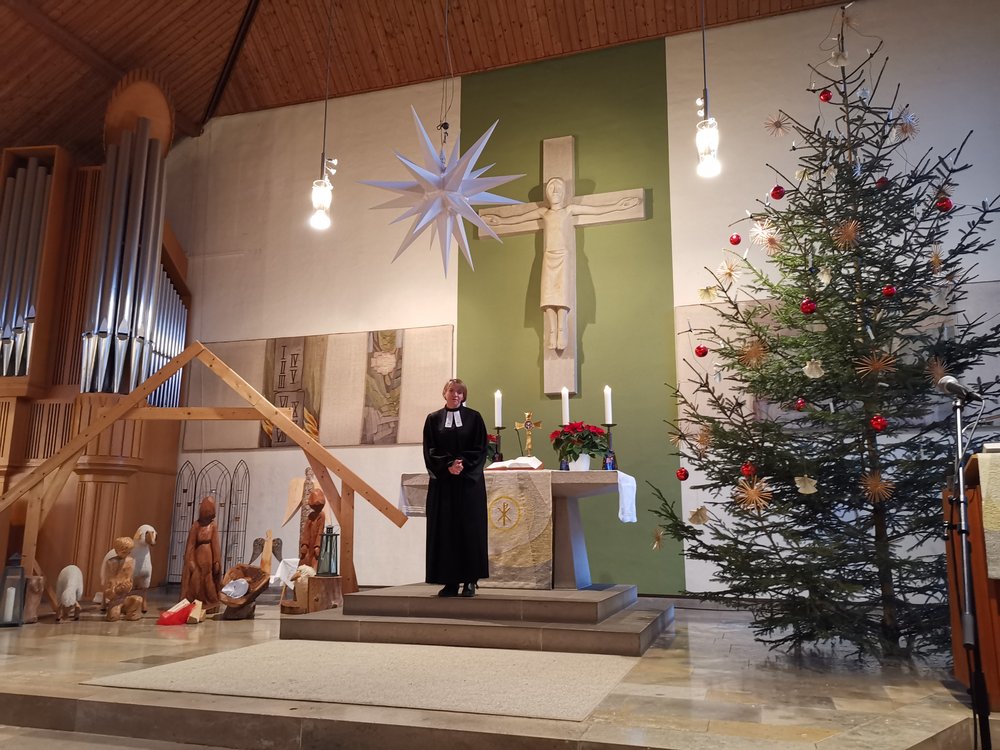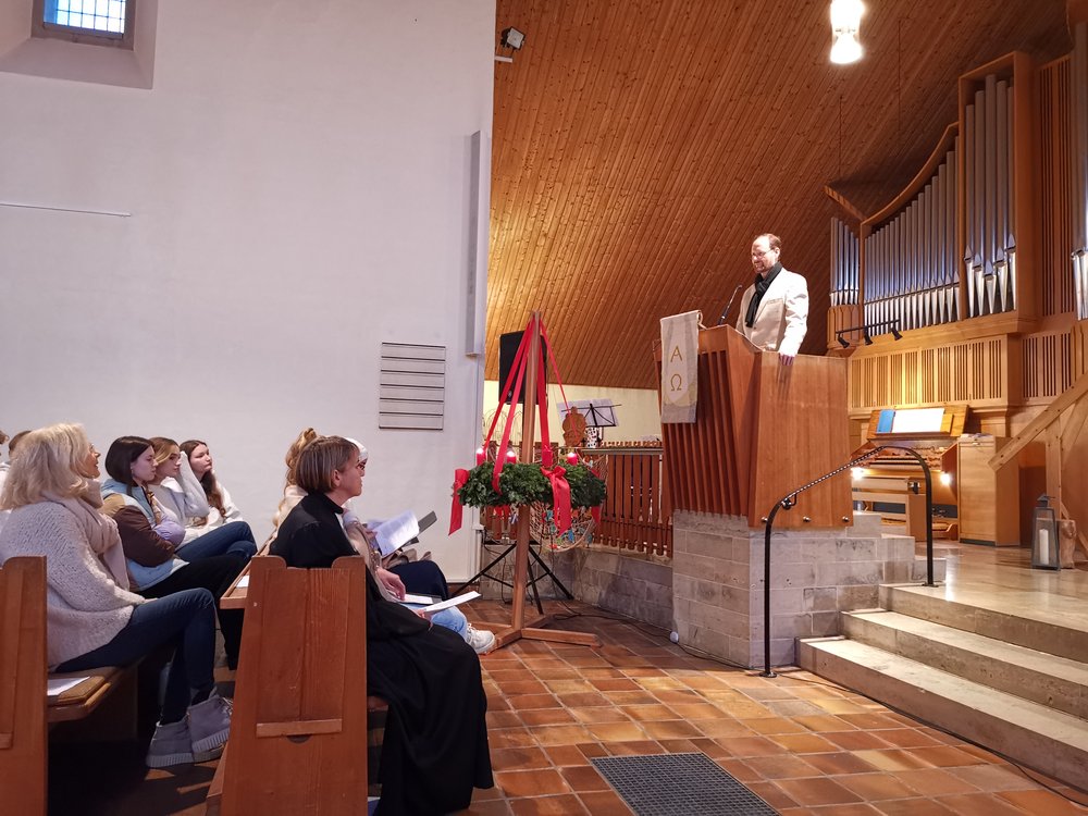 Frau Magnussen rundete die Andachtsthemen mit ihren Gedanken über die alljährlich zu erwartenden, vorweihnachtlichen Diskussionen der Familien um die Beschaffenheit des Christbaums ab. Dabei stellte sie den Charme jener Charakterbäume heraus, die den Verkauf die längste Zeit überlebten. Weihnachten zeigt somit, dass es letztlich nicht um das Perfekte ginge, was wir Menschen ja doch oft erwarteten: etwa Lehrer die tadellosen Schüler und Schüler die perfekten Lehrer. Sie spendete in den Andachten den Segen, wobei sie die Gemeinde jedesmal auch im Namen ihres erkrankten katholischen Kollegen grüßen ließ.