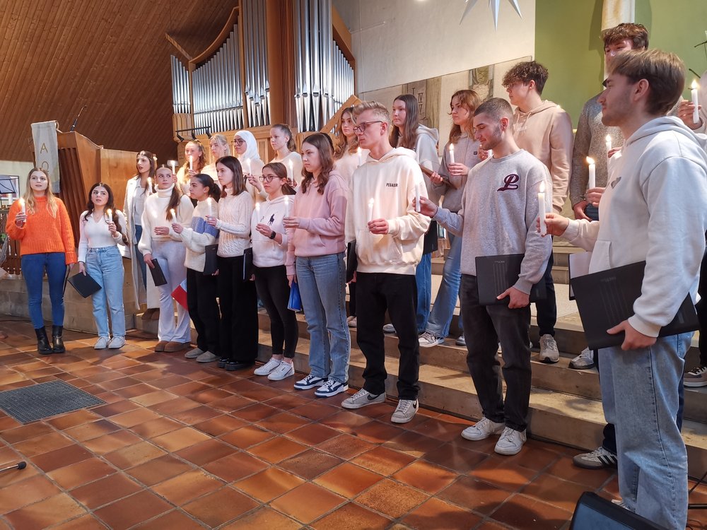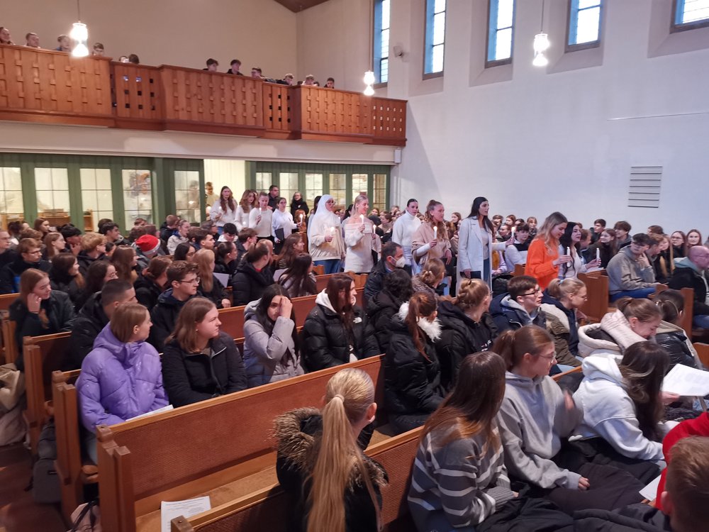 Verändern müssten sich auf dieser Welt auch die Mächtigen. Die einfachen Soldaten und Offiziere, so hörten wir in der Andacht der Oberstufe vom Religionskurs von Frau Walter, hätten im Ersten Weltkrieg eine Feuerpause eingelegt und gemeinsam Jesu Geburtstag gefeiert. Geschenke sogar hätten sie einander gemacht: Bier gegen Pudding. Versöhnliches im Geiste Jesu sei ihnen aber von oben bald verboten worden. Menschen, die sich kennen, aber nicht aufeinander schießen, bestimmen denen ohne Macht, die sich nicht kennen, aufeinander zu schießen (nach Shaw). Sehnsucht nach Frieden in den aktuellen Kriegsgebieten brachten die Fürbitten natürlich zum Ausdruck.