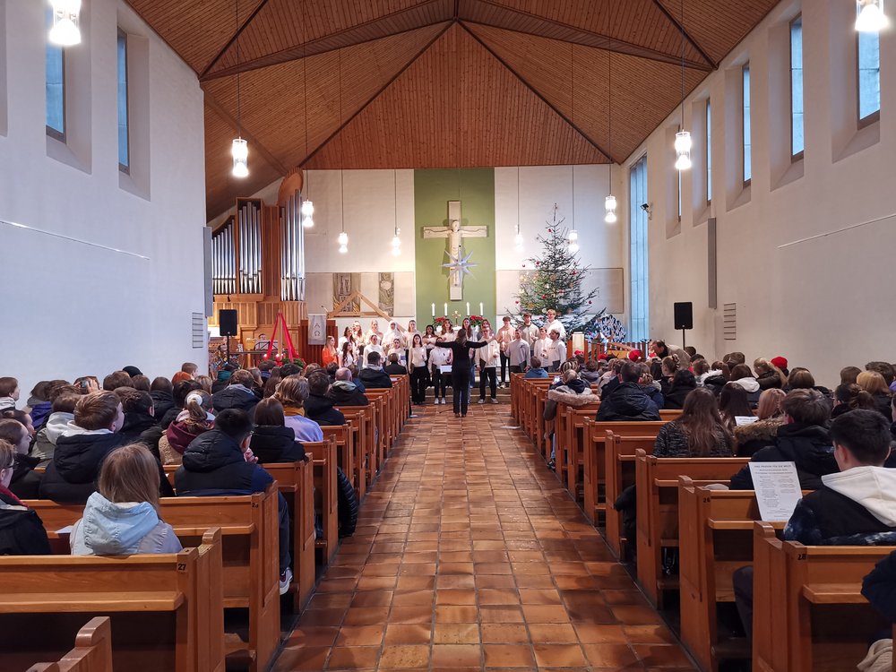 Glockenhell erklang an der Krippe Leontovychs Carol, vom Engelchor der Oberstufe unter der Leitung von Frau Grundmeier und Frau Schinzel intoniert. Ihr Repertoire umfasste in den kommenden Andachten multikulturelle, auch weihnachtliche, Genüsse insgesamt aus der Ukraine, sodann Nordamerika und Island. Der Chor überzeugte sehr. „O du fröhliche“ rundete oft ab.