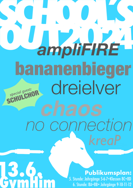 Mittlerweile schon zum dritten Mal fand unser „School´s Out“- Konzert in der vorletzten Schulwoche vor den Sommerferien statt. Aus der Band-AG unter der Leitung von Herrn Schonebeck und Herrn Blohmer erwachsen, sollen hier grundsätzlich alle musikalischen Aktivitäten unserer Schule eine Bühne bekommen. Die Anstrengungen und Ergebnisse der Probenarbeiten des gesamten Schuljahres aus den verschiedensten Kursen sollen sichtbar werden, bzw. zu Gehör kommen.