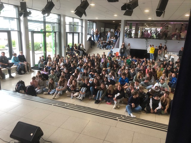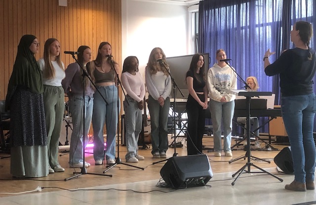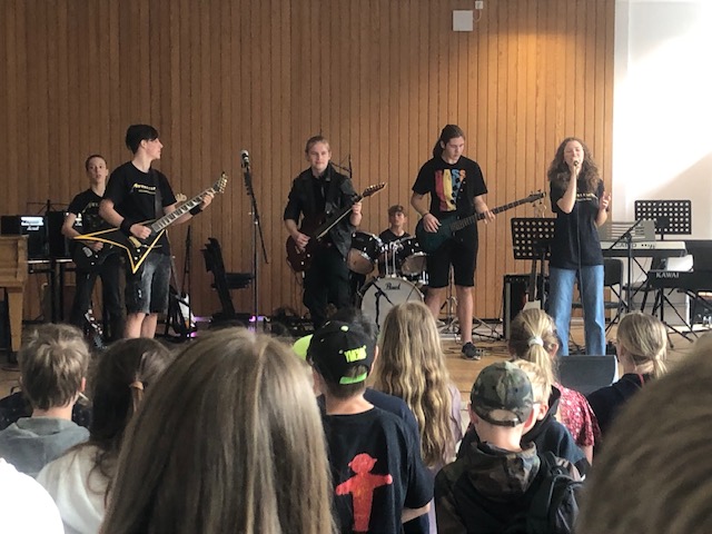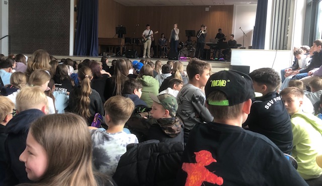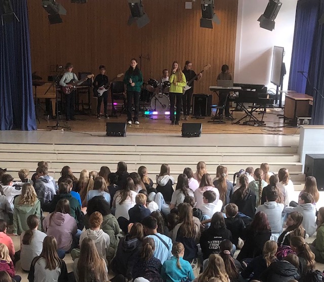 Die Herausfordrung für die Bands (und die Lehrkräfte) ist jedes Jahr wieder besonders. Die unterschiedlichsten Spielniveaus und Jahrgänge müssen sich zusammenfinden und sich dann auch noch geschmacklich auf eine Musikrichtung und Songs einigen. Songs müssen für besondere Besetzungen und Fähigkeiten von instrumentalen Anfängern angepasst werden. „Wir haben keinen Schlagzeuger, was sollen wir jetzt machen? Und was spielt überhaupt die Trompete?“ Spätestens bei den intensiven Proben während der Kreativtage im Freizeitheim auf dem Wohldenberg wird dann alles so in Form gebracht, dass es anschließend auf die Bühne kann. Dort erleben die Schülerinnen und Schüler in Ansätzen tatsächlich was intensive kreative Arbeit, z.B. als Musiker/in bedeutet. Die Bandformationen rücken hier nochmal viel enger zusammen. Die Vorfreude auf die große Bühne im Schulfoyer wächst.