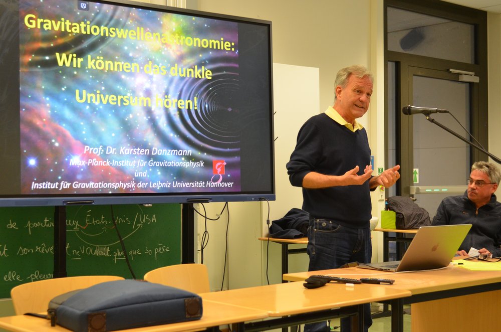 Am 22. Oktober 2024 sprach der in der Forschung international bekannte Physiker Prof. Dr. Danzmann am Gymnasium Himmelsthür vor ca. 100 Physikschülerinnen und Schülern über seine beiden Forschungsgebiete der Laserinterferometrie (Technik zur Messung der Raumkrümmung) und der Gravitationswellenastronomie.