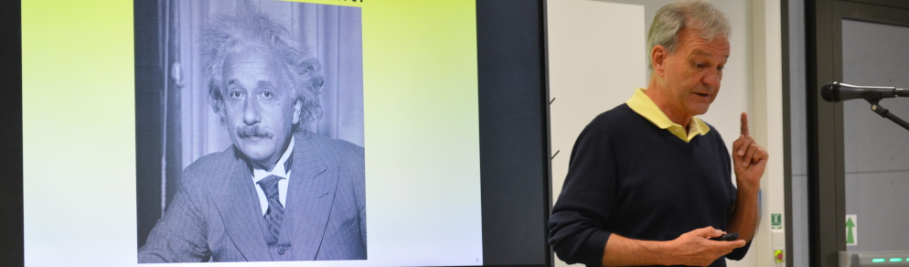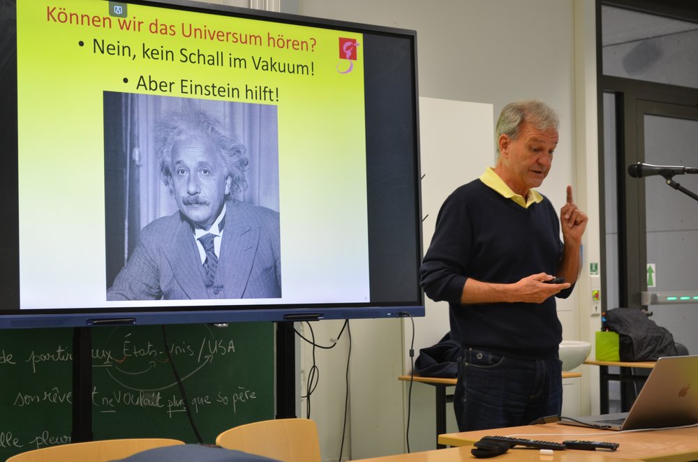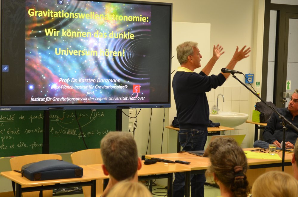 „Wie hört es sich zum Beispiel an, wenn zwei schwarze Löcher im All fusionieren?“, fragte er seine Zuhörerschar und gab allen anschließend die überraschende Antwort, indem er ihnen die in akustische Signale transformierten Gravitationswellen vorspielte. Dieser Beginn des Vortrags deutete schon an, dass es sich bei dieser Physik-Doppelstunde um eine in jeder Hinsicht außergewöhnliche Veranstaltung handelte, die neben dem regulären Unterricht stattfinden konnte. Gespannt lauschten die Teilnehmer den Worten des Professors, der sie über sechzig Minuten lang in die Welt der allgemeinen Relativitätstheorie Albert Einsteins im Jahr 1915 bis hin zur Planung des LISA-Observatoriums für Gravitationswellenmessung im All im Jahr 2050 entführte.