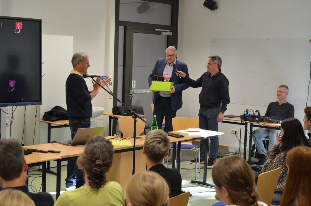 Herr Klingenberg, der 1.Vorsitzende des Fördervereins, bedankte sich im Anschluss bei dem sympathischen Naturwissenschaftler für sein faszinierendes Referat und überreichte ihm einen prall gefüllten Präsentkorb, den der Professor dann zusammen mit dem langanhaltenden Applaus des Auditoriums mit zurück an die Universität Hannover nehmen konnte.