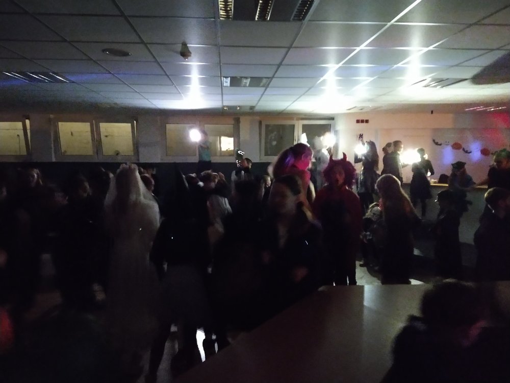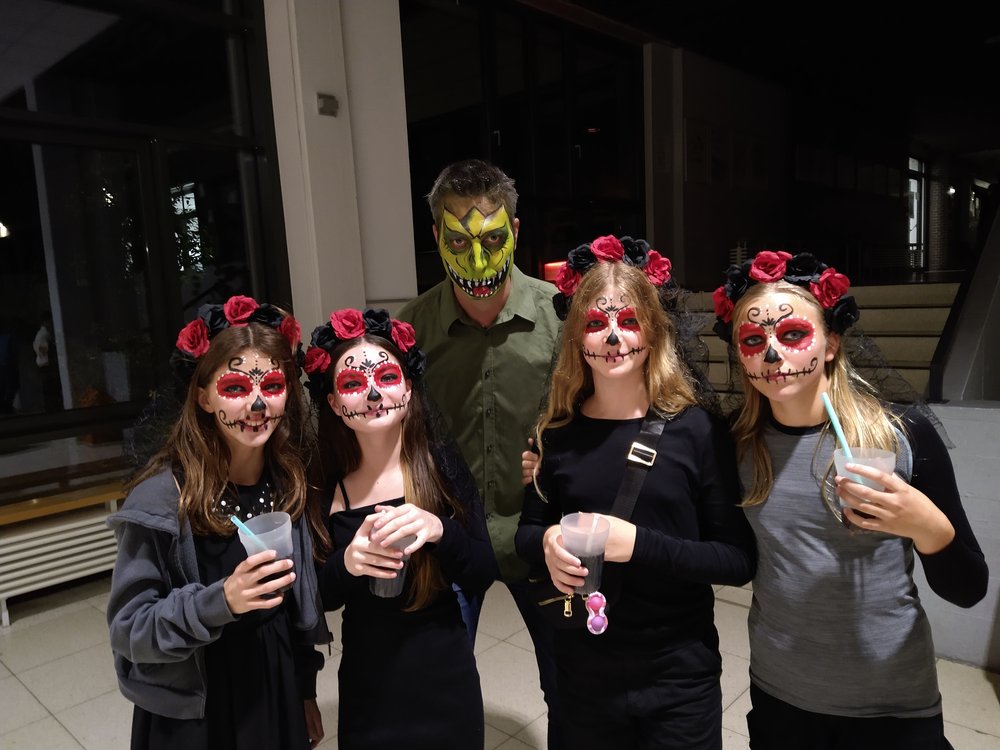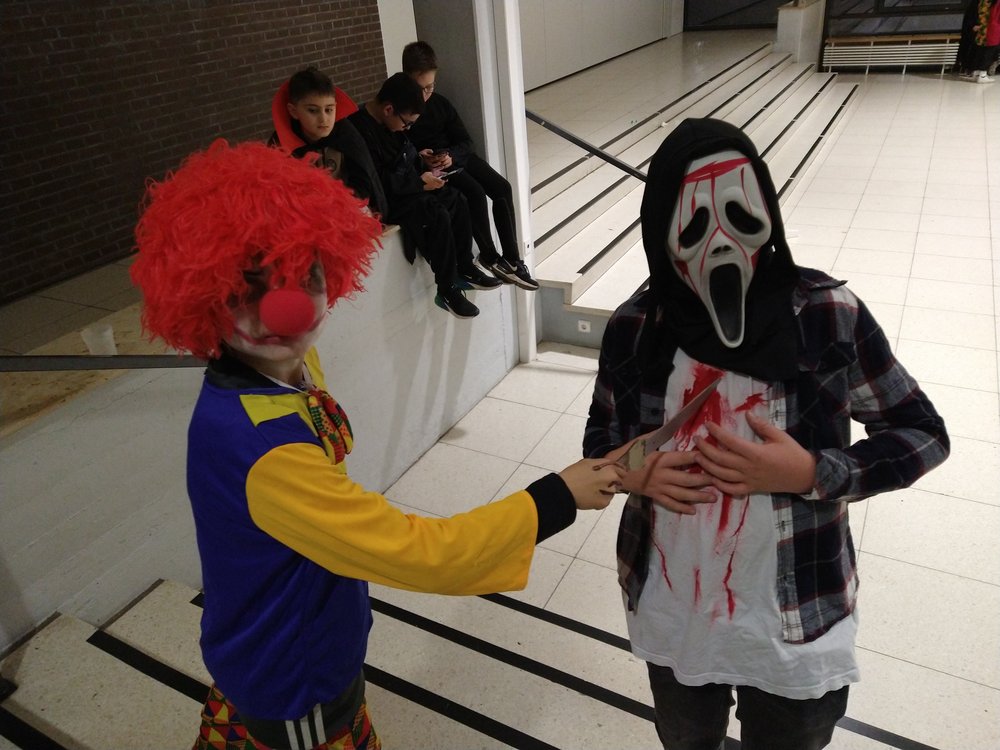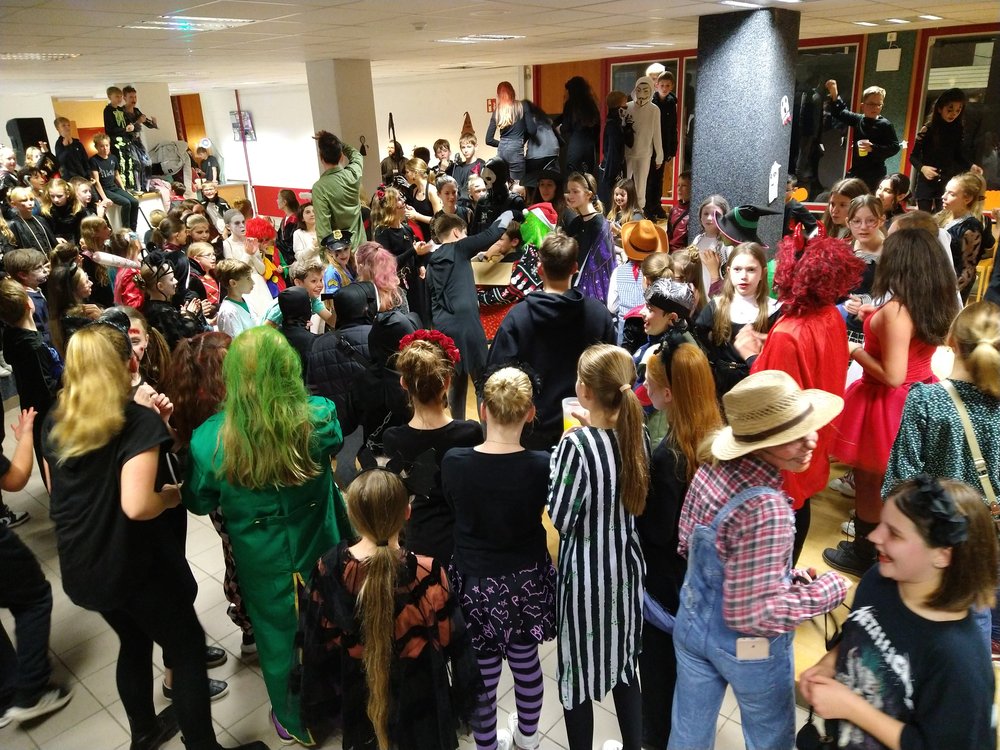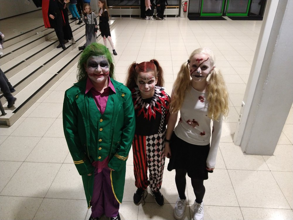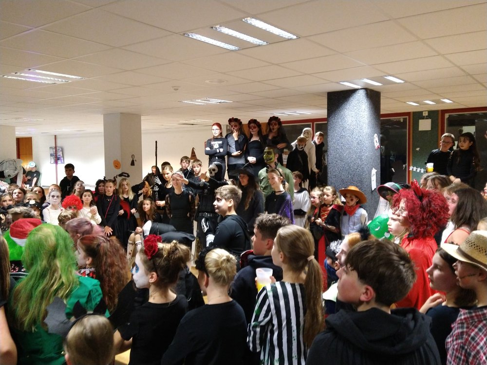 Gespenster, Vampire, Zombies, Monster und Gruselclowns: Sie alle waren zu Gast bei der Fohlen-Halloween-Party am 3. November. Das GymHim hatte eingeladen und mehr als hundert Schülerinnen und Schüler der fünften, sechsten und siebten Klassen kamen ab 18 Uhr an den Ort, an dem sie ansonsten Klassenarbeiten schreiben und Referate halten müssen, um nun an gleicher Stelle gemeinsam zu feiern. Viele waren so hervorragend kostümiert, dass der ein oder andere Schreckensschrei in der düsteren Schule zu hören war. Dabei waren es vor allem die selbst hergestellten Kostüme, die aufwändigen Masken und geschminkten Fratzen, die dafür sorgten, dass es einem kalt den Rücken herunterlief.