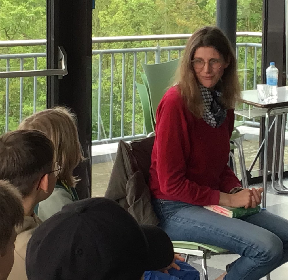 Nikola Huppertz las in den 90 minütigen Sitzungen im Konferenzraum der Mensa den Schülerinnen und Schülern aus ihrem Abenteuer-Roman „Unser Sommer am See“ (erschienen im Thienemann-Verlag) vor. Dabei bezog sie immer wieder die neugierigen Zuhörer*innen in ihren Lesevortrag ein und erklärte interessante Hintergründe zur Geschichte, die in ihrem Buch erzählt wird. Anschließend hatten die Fünftklässler*innen Gelegenheit, Fragen zu stellen, und davon wurde ausgiebig Gebrauch gemacht. So erfuhr man z.B., dass Frau Huppertz ungefähr ein Jahr braucht, um ein Buch zu schreiben, und wie schwierig es ist, einen Verlag zu finden, der bereit ist, aus einem Text ein richtiges Buch zu machen. Ihre Ideen für neue Geschichten basieren zumeist auf eigenen Erlebnissen und werden von der Autorin dann zu einer Erzählung oder einem Roman geformt, dabei arbeitet sie sowohl ganz klassisch mit Stift und Papier als auch am Computer. Zum Schluss konnten sich die Schülerinnen und Schüler noch eine persönlich signierte Autogrammkarte von Frau Huppertz sichern. Im Gespräch zeigte sich, dass viele Fünftklässler von dieser besonderen Aktion an unserer Schule begeistert waren und nun auch selbst ein Buch von Nikola Huppertz lesen möchten.