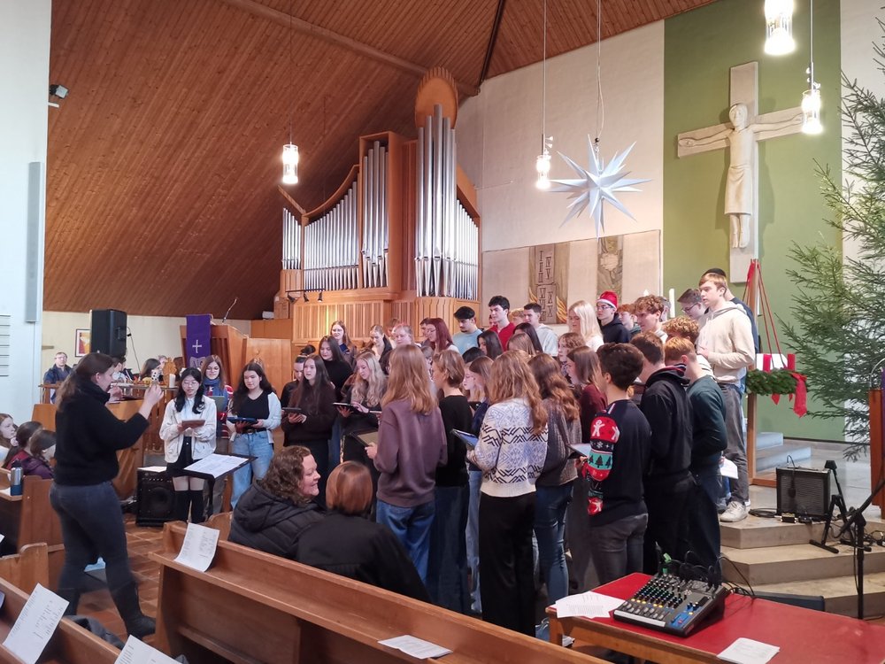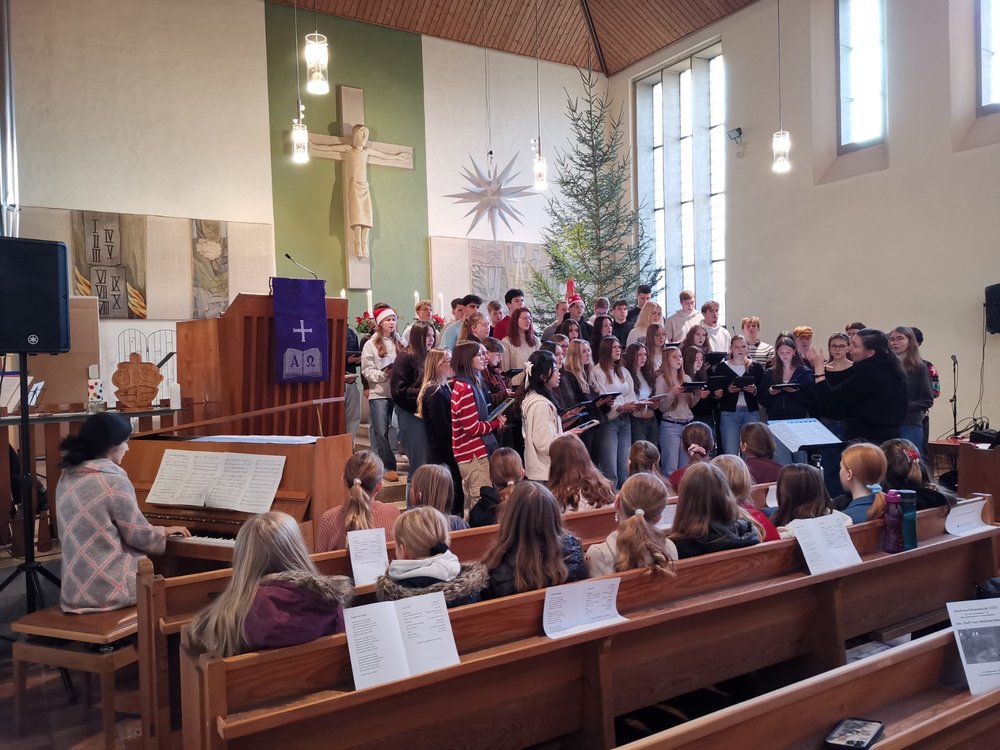 "Der HERR schaut vom Himmel und sieht alle Menschenkinder …" (Ps 33,13ff.). Das war die Lesung des Religionskurses von Herrn Riege in der Andacht der Jgg. 9/10. Weihnachten sei ein Angebot für uns Menschen. Aber es gebe viele Möglichkeiten damit umzugehen. Es gebe verschiedene Familienkulturen, Weihnachten zu begehen: gemütlich, besinnlich, geistlich oder auch gar nicht. Am Ende gab es noch als give-away den Weihnachtsgruß in etlichen Sprachen. Denn der Herr sehe alle Menschenkinder und lasse sie grüßen.