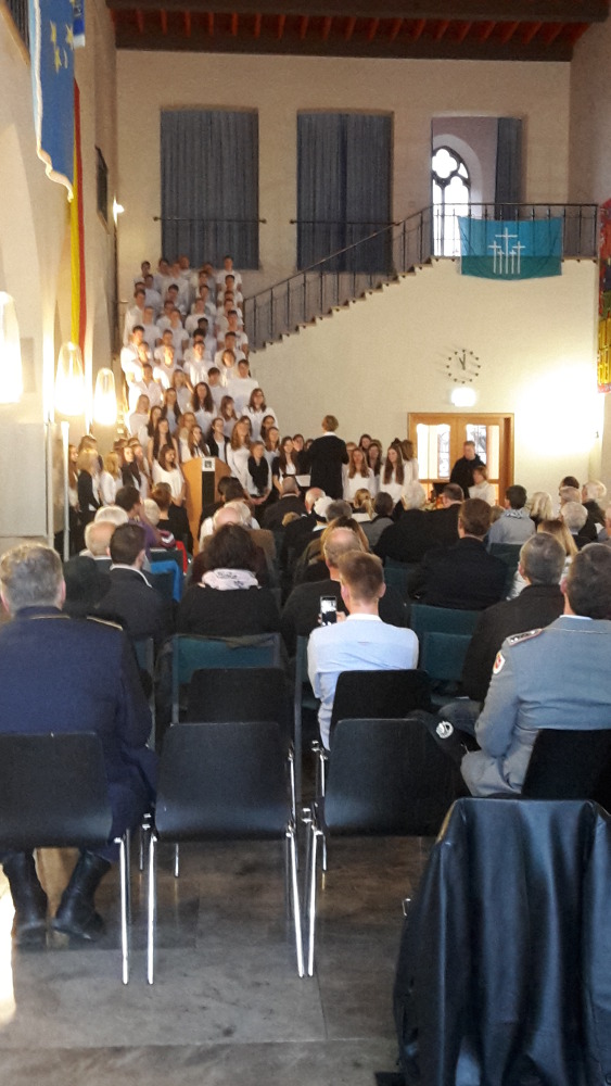 Unter der Leitung von Frau Köhler und Frau Rolf verlieh der über 80köpfige Oberstufenchor dem Gedenken einen würdigen Rahmen. Mit stimmlicher Wucht, aber dennoch getragen und nachdenklich trug der Chor mit seinen Stücken zur gedämpften Atmosphäre im Rathaus bei.